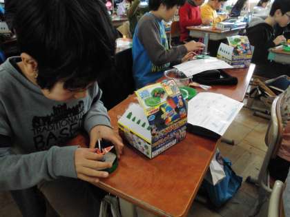 写真はキットを使って,磁石の力で動くおもちゃを作っている様子です。