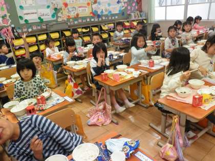 今日は,給食二日目。メニューはご飯・牛肉のしぐれ煮・金時豆の甘煮・すまし汁でした。みんなおいしくいただき,おかわりに行列もできました。中には,ごはんを3杯も食べる1年生がいてびっくりです。
