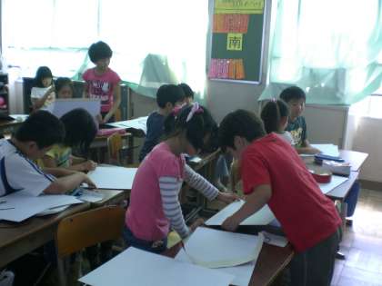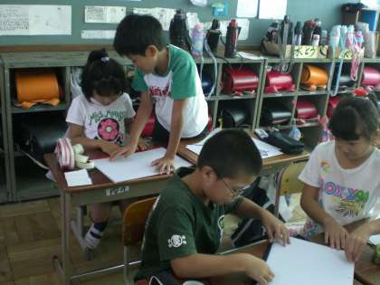 3年生の図工の時間に書道のファイルを作りました。3年生から6年生までの4年間、自分の作品を大切に作成するためのファイルです。みんな、隣同士で協力して取り組んでいました。
