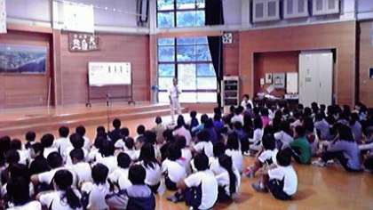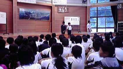 寝具を片付けて ホールに集合。朝の集いは,左京の明徳小学校と一緒です。学校紹介や素敵な歌声の交歓ができました。