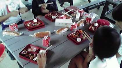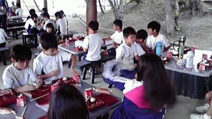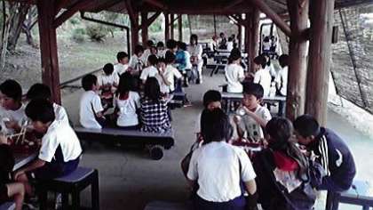 今朝の食事場所は,あずまやです。快晴のすがすがしい風の中,食事も進みます。食べながら,今日一日の活動の話で 盛り上がりました。午前中は,磯観察です。どんな発見があるでしょうか。
