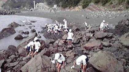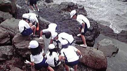 宮崎浜で磯観察。海の生き物を見つけて大はしゃぎ!お天気もよく11:30の大潮を待っています。