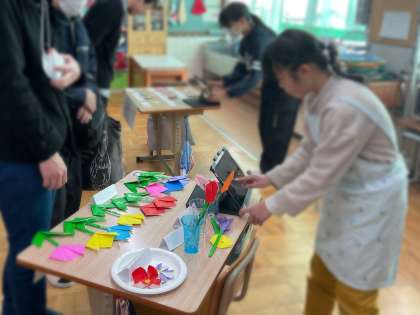 今年の学習発表会はおみせやさんを開きました。お寿司屋さんやパン屋さん、お花屋さん、アイロンビーズやさん、わなげやさん、さかなつりやさんの6店舗に分かれて、それぞれの店の店員さんになり、先生方や保護者の方を招きました。商品は全て子どもたちが時間をかけて一生懸命に手作りしました。商品の札や値段も子どもたちが書きました。