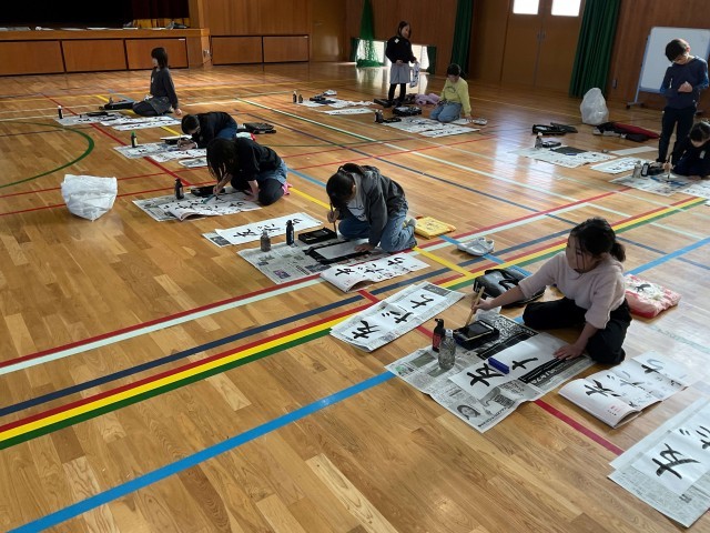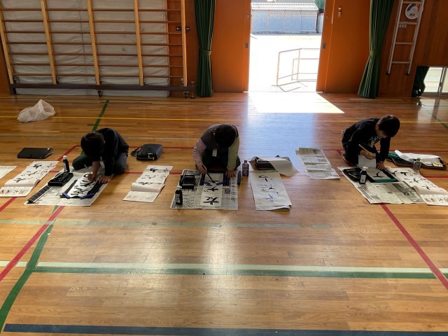 普段は椅子に座って机の上で書いていますが、体育館で床に座って行いました。