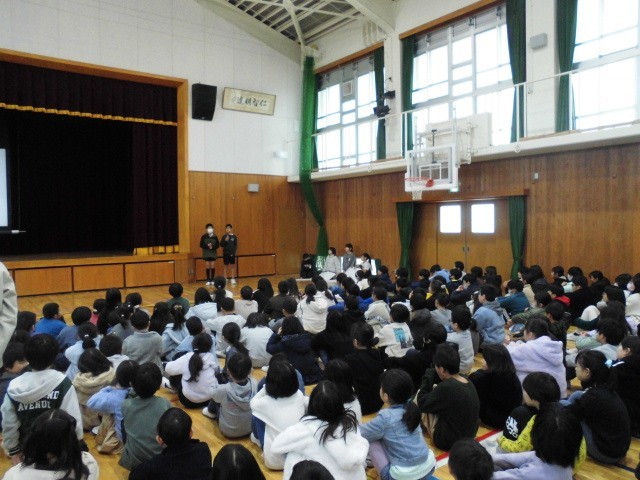 はじめに学校長の話を聞きました。寒い日が続いているので健康に気を付けること、みんなが学習や取組でがんばっていることが認められて、いろいろな方が桂小学校に視察に来られること、自分もまわりの人も大切にする6年生の様子を紹介し、1~5年生のみんなも自分もまわりの人も大切にする桂小学校にしようということを、学校長から聞きました。