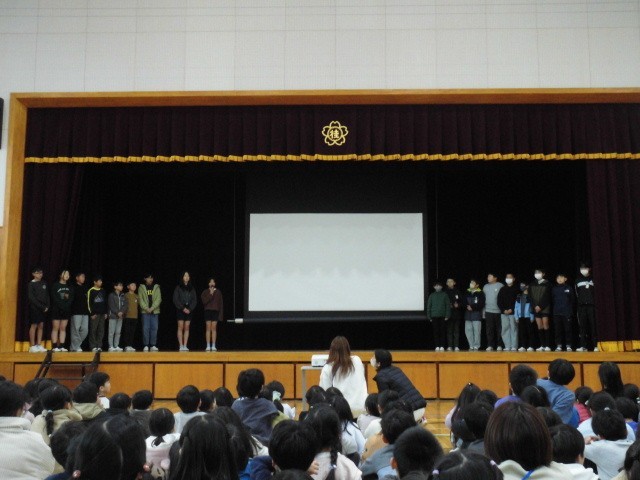 本部委員会から、今月の目標を発表しました。今月の目標は「目指せ忘れ物0(ゼロ)」です。①時間割に持ち物を書き込む ②帰る前に忘れ物がないかチェックする ③家を出る前にも一度チェックする という3つのアドバイスを聞きました。
