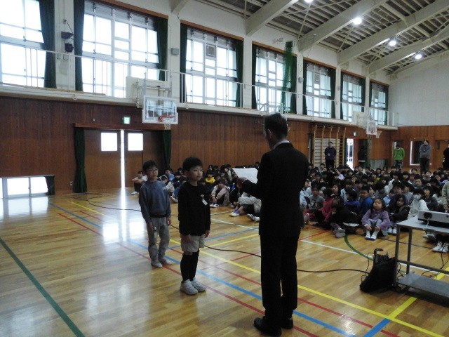 今日もたくさんの子どもたちに賞状が届きました。代表の児童に学校長から賞状を渡しました。