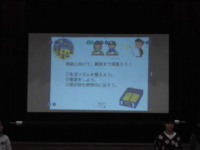 本部委員会から、今月の生活目標「進級に向けて最後まで頑張ろう!①生活リズムを整えよう②復習をしよう③提出物を期限内に出そう」についての発表をしました。