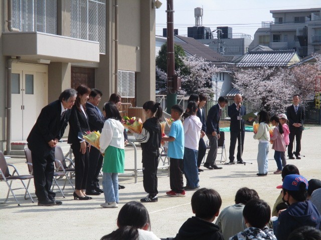 校庭のまわりには桜が美しく咲き、春を通り過ぎて初夏を感じさせるあたたかな日差しのもとで離任式が行われました。