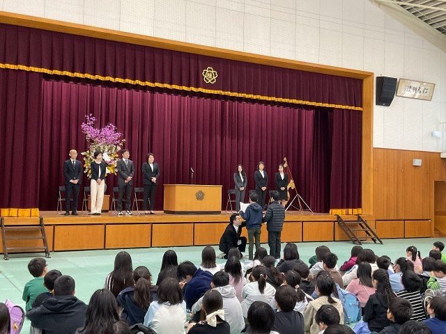 4月10日(金)、あいにくの雨でしたので、令和8年度着任式・始業式を体育館で行いました。