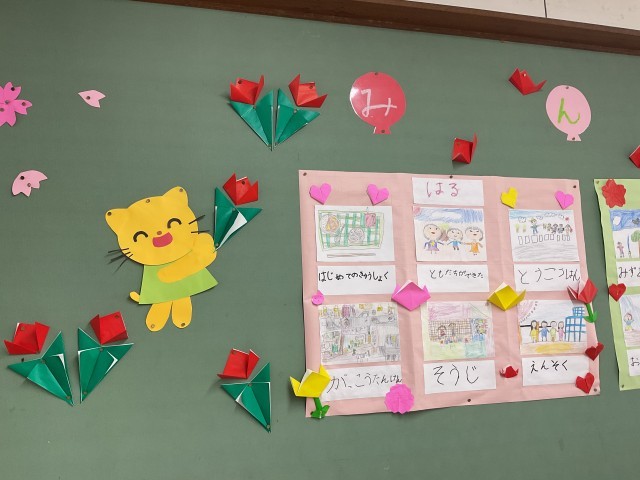 1年生の教室の中には、2年生がかいてくれた絵や半日入学で自分たちが折った折り紙などが飾られています。