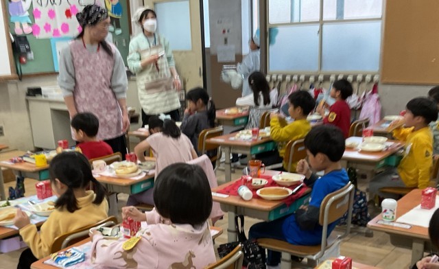 後ろ姿で表情が見えませんが、とてもおいしそうに食べていました。おかわりをする子もいました。明日はどんな献立なのかとても楽しみですね。