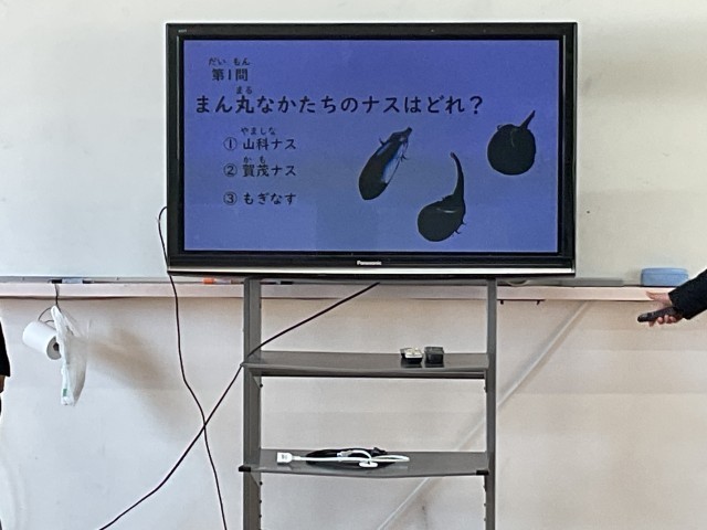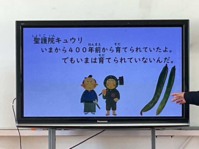 京野菜クイズを通して、京野菜について楽しく知ることができました。賀茂茄子や聖護院きゅうりなど初めて聞く京野菜がたくさんあったり、給食でも食べている京野菜もあり、親しみをもって取り組んでいました。