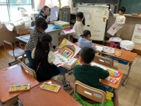 ALTの先生に来てもらい、英語で形の言い方を学習しました。英語の形ビンゴもして、...