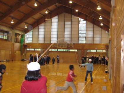 午後からはアスレチックで活動する予定でしたが,雨が降ったりやんだりでロープウェイなどがぬれるなどしているので中止しました。そのかわりに,プレイホールで綱引きや大縄跳びをしました。綱引きでは男子対女子もして女子が勝ちました。