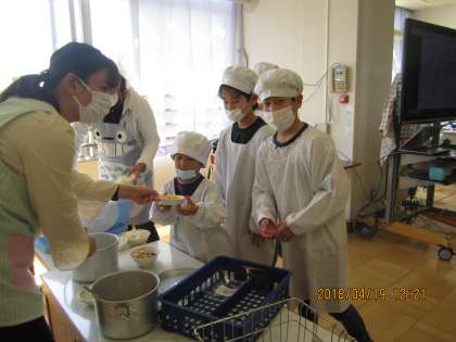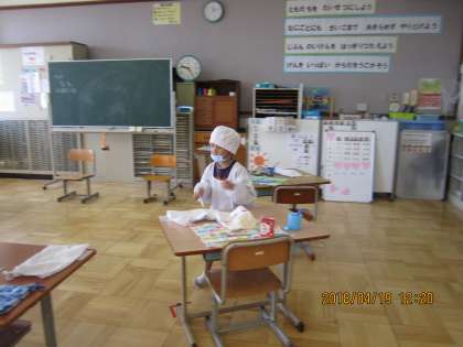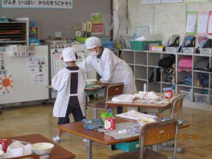 1組では1年生〜6年生までの児童が協力し合って給食の準備を行います。