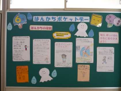 6月26日は「はんかちポケットデー」でした。全校の様子は,469人中398人,85%の人がポケットにはんかちが入っていました。5月に続いて6年2組は100%でした。素晴らしい!!