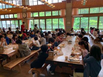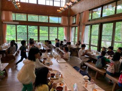 朝のつどいの後は、朝食です。今日の活動は,まずラインオリエンテーリングです。しっかり朝ご飯を食べて準備しましょう。今のお天気は,すこし曇っています。