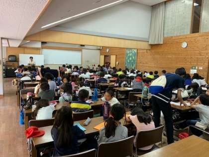 活動の振り返りをしてます。一人一人どんなことが思い出に残ったかな?この後,山の家最後のお昼ご飯をいただきます。