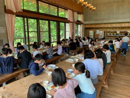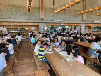 宿泊学習最後のお昼ご飯をいただいています。今日のメニューは,チャーハンかきつねうどんを選びました♪