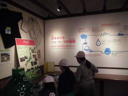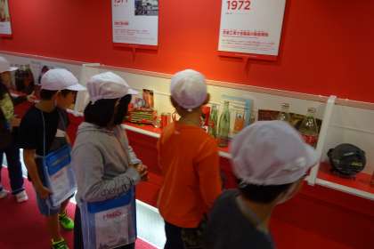 工場では,飲み物が作られている様子や働く人の様子を実際に見学させてもらったり,写真や映像で詳しく教えていただいたりしました。飲み物の入った大きなボトルや,製品の缶が次々と流れているレーンなどを見て,「すごい!」と驚く子どもたちでした。