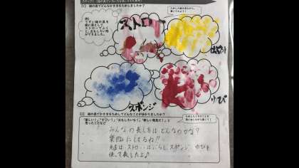 身近にあるおりがみに,もようをえがき,ノートに貼りました。みんなはどんな『ゆめもよう』をつくっているのかな?