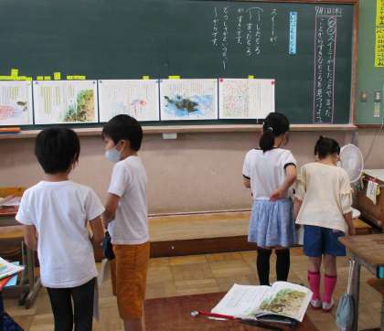 「スイミー」のお話の中から,スイミーの大好きなところを見つけ,友だちと紹介し合いました。スイミーの大好きなところと,そう思うわけを友だちと交流する中で,「スイミーって優しいな。」「わたしはたくましいと思うよ。」「遊ぶことが大好きなんじゃないかな。」など,スイミーに対するたくさんの思いを出し合うことができました。一生懸命に学習に取り組む姿がすてきでした。