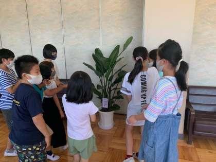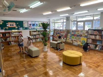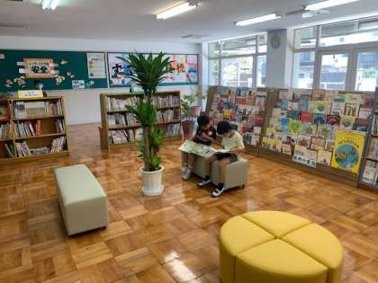畳敷きだった1階のキッズルームを夏の職員作業でフローリングにし,ワックスがけをした後に,ブロック型のチェアを置きました。子どもたちの教育環境をよりよくするため,PTAから観葉植物を2鉢購入していただきました。キッズルームにおいてあるのは,ドラセナ・マッサンゲアナ(幸福の木)です。緑があると,少し気持ちがほっとします。ここはカフェ?と見間違うほどです。3階の図書室前にも,種類の違うものを置きました。学校に来られるようになったときに,是非見てください。