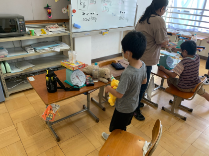 重さの学習をしているグループでは,1kgはかり,2kgはかりを使って,学習を進めていました。今日は,そのはかりを使って,教室にあるもので500g,1kgになるように量感の学習をしていました。少しずつ慣れてくると,大体の重さを載せたあと,小さいもので重さの調節をうまくしていましたね。