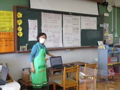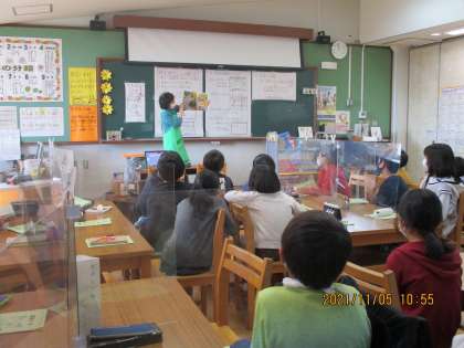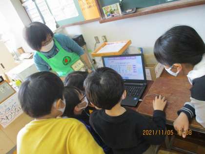 今日は,学校司書の磯部先生と一緒に学習しました。はじめに本の読み聞かせをしてもらい,次に資料検索の方法について教えてもらいました。検索用パソコンを使って,読みたい本を検索したり,予約をしたりできます。ますます図書室の利用が楽しくなりますね。