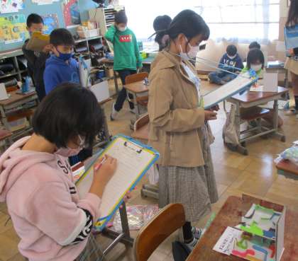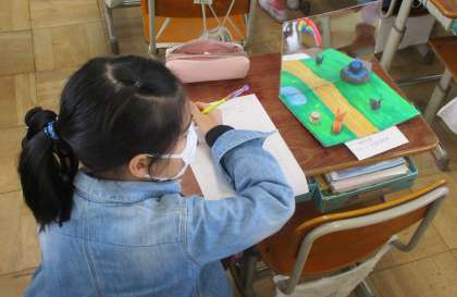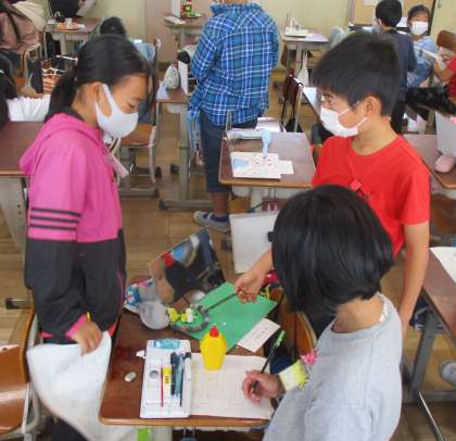 図画工作科では,「ミラクル!ミラーステージ」の学習で,鏡に広がる世界をつくりました。鑑賞では,「これすごい!」「鏡を生かしている!」などと,友だちの作品のよさや面白さを感じている様子でした。