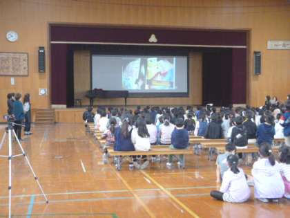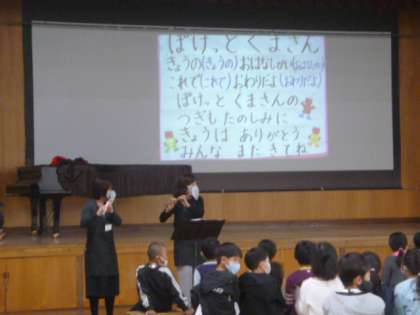 中間休みに,ぽけっとくまさんによる本の読み聞かせがありました。