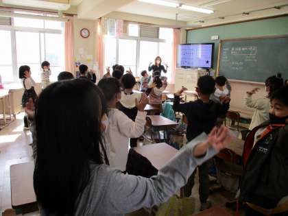 韓国・朝鮮の衣装「チマ・チョゴリ」「パジ・チョゴリ」を見たり,踊りをいれながら歌を歌ったりして学習しました。
