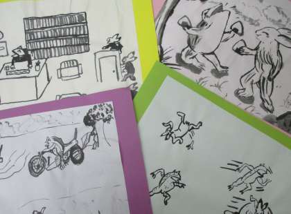 国語科『「鳥獣戯画」を読む』ですみ絵の面白さに気付いた子どもたち。今日は実際にすみ絵を描いてみることにしました。教科書で紹介された鳥獣戯画の続きを想像し,思い思いに描きました。ある子は相撲をとった後に会社に出勤するカエルとウサギを,ある子はカエルがウサギと一緒におにぎりを食べる様子をと,子どもたちの想像は膨らむばかり。物語が想像できる,面白い作品が出来上がりました。