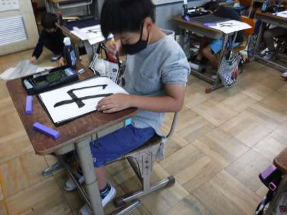 ”力という字を力強く書こう!”をテーマに書いた一文字。思ったように書けた時の子ども達の表情はとても満足そうです。