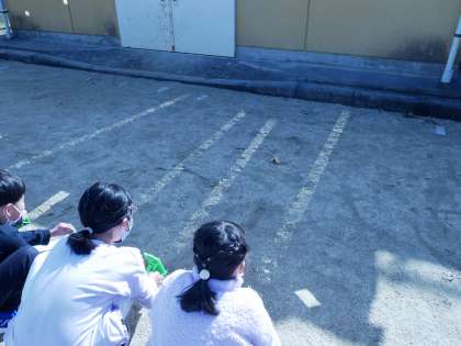 今日は「かがみではね返した日光は,どのように進むのでしょうか。」という問題をもとに実験をしました。はね返した日光の道筋を地面にうつしたり,かがみとはね返した日光がかべに当たった間を調べたりしました。子どもたちからは,