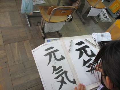 今回は,「元気」という文字を書きました。これまでに学習した「おれ」「まがり」「はらい」などをしっかりと意識して書いています。小筆の使い方もずいぶんと上手になり,名前まで集中して書けました。