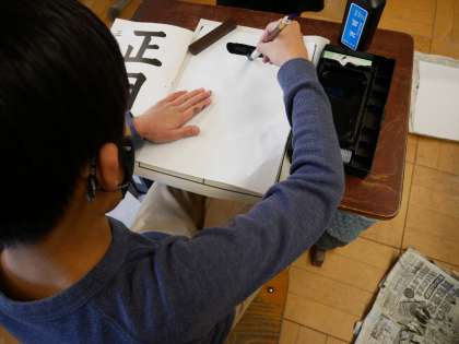 3年生は今日,書きぞめをしました。今まで学習したことをいかして,「正月」を書きました。「とめ」「はね」「はらい」に気を付けて,ゆっくり丁寧に書くことができました。子どもたちからは,