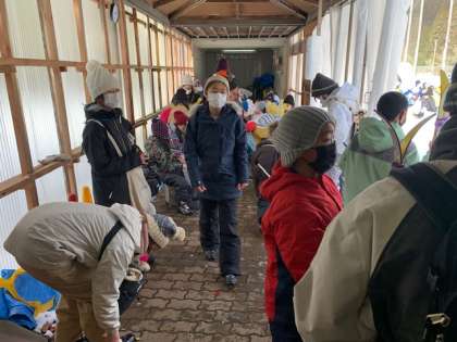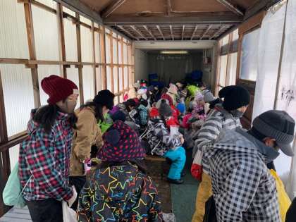 歩いてグラウンドまでやってきました。いい準備運動です。所員さんから説明を聞き,借りていった靴を履き,荷物を置いて次はスキー板です。