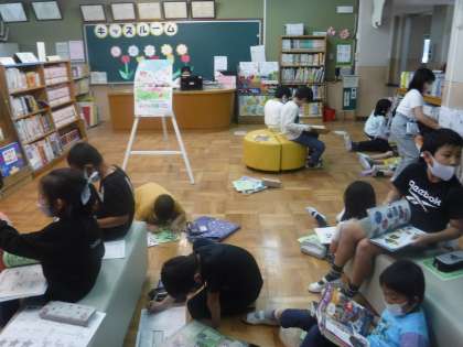 これまでは1階のキッズルームで絵本をたくさん読んでいた3年生の子ども達。3階の図書館に来てみて目をキラキラさせていました。