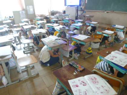 まず各教室で安全ノートで避難の仕方などを学習したあと,避難訓練の放送がなり,机の下に頭部を入れました。