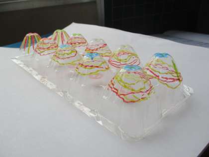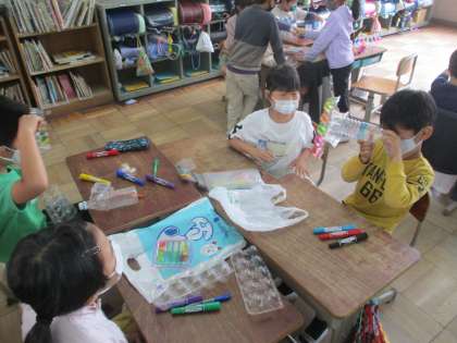 図画工作科で「光のプレゼント」の学習をしました。透明のパックに色を付けるといろいろな形が見えてきます。「ふしぎな世界が見えるよ。」「パックを重ねると,ちがう色が見えるよ。」など,作った作品をグループで紹介しあいました。