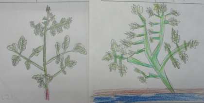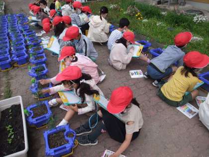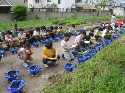 今日は,さっそく一人一人植えたミニトマトの観察カードをつくりました。「もうすぐ咲きそうなつぼみがありました。」「はっぱをさわるとざらざらしました。」「はっぱもトマトのにおいがしました。」など,見つけたことを言葉にすることができました。