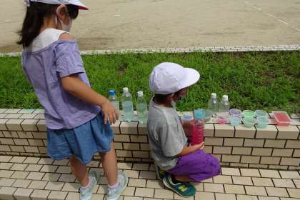 絵の具を少し水に溶かし、色水を作って楽しみました。「メロンジュースみたいになった。」「青と赤で紫になった。」と発見がいっぱいだったようです。友だちとカップを並べて楽しむ姿も見られました。