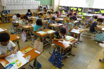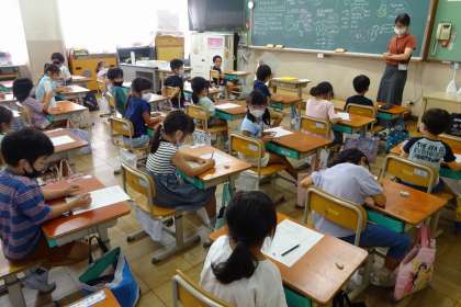 図画工作科では、お話を聞いて思い浮かべたことを絵に表します。3クラスそれぞれ違うお話に取り組んでいます。かえるにひつじ、くまなどお話に登場する動物を思い浮かべながら描きました。どんな絵が出来上がるか楽しみです。