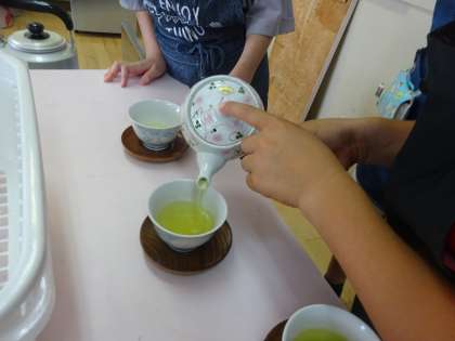 5年生が家庭科の調理実習でお茶を淹れました。班で協力しておいしいお茶を淹れることができました。ぜひご家庭でも一緒に淹れてみてください。