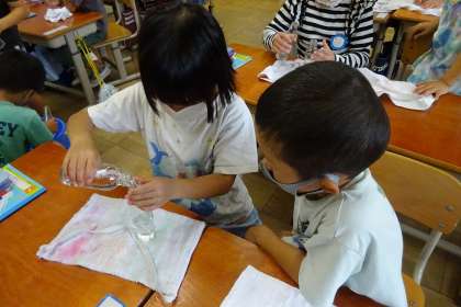 2つのびんを使って、どちらが多く水が入るかかさ比べをしました。片方のびんに水を入れ、もう一つのびんに移していきます。びんを入れ替えて反対も確かめている子どももいました。家にある物でも比べてみたいという声が聞こえてきました。