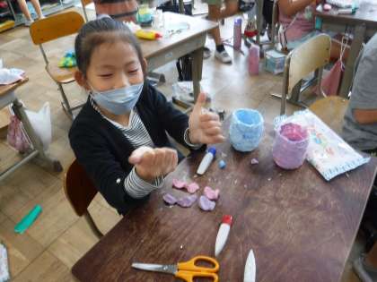 図画工作「空き容器のへんしん」では、家にあった空き容器と紙粘土を使って自分だけの入れ物を作りました。