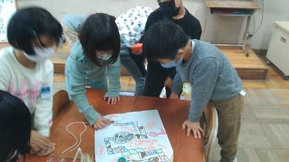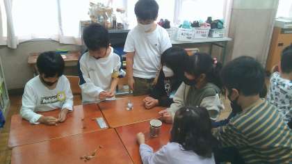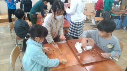 2年生を招待し、秋のおもちゃで一緒に遊びました。1年生は来てくれた2年生に、「これ、めっちゃ難しいねんで」「こうやって遊ぶんやで」など、一生懸命伝えていました。これまで頑張って作ってきたおもちゃで楽しんでもらえて、とてもうれしそうでした。