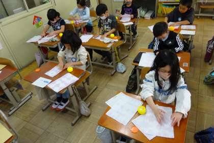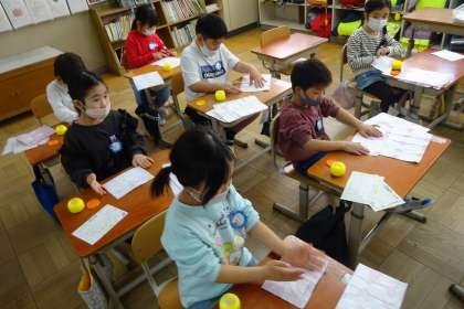 4月に入学してくる1年生に、朝顔の種をプレゼントする準備をしました。朝顔の色水で染めた和紙の封筒に手紙と種を入れました。手紙には、「体育のパスゲームが楽しいよ。」「給食は、プリプリ中華炒めがおいしいよ。」「一緒に遊ぼうね。」といった言葉が見られました。1年生の入学が待ち遠しいようです。